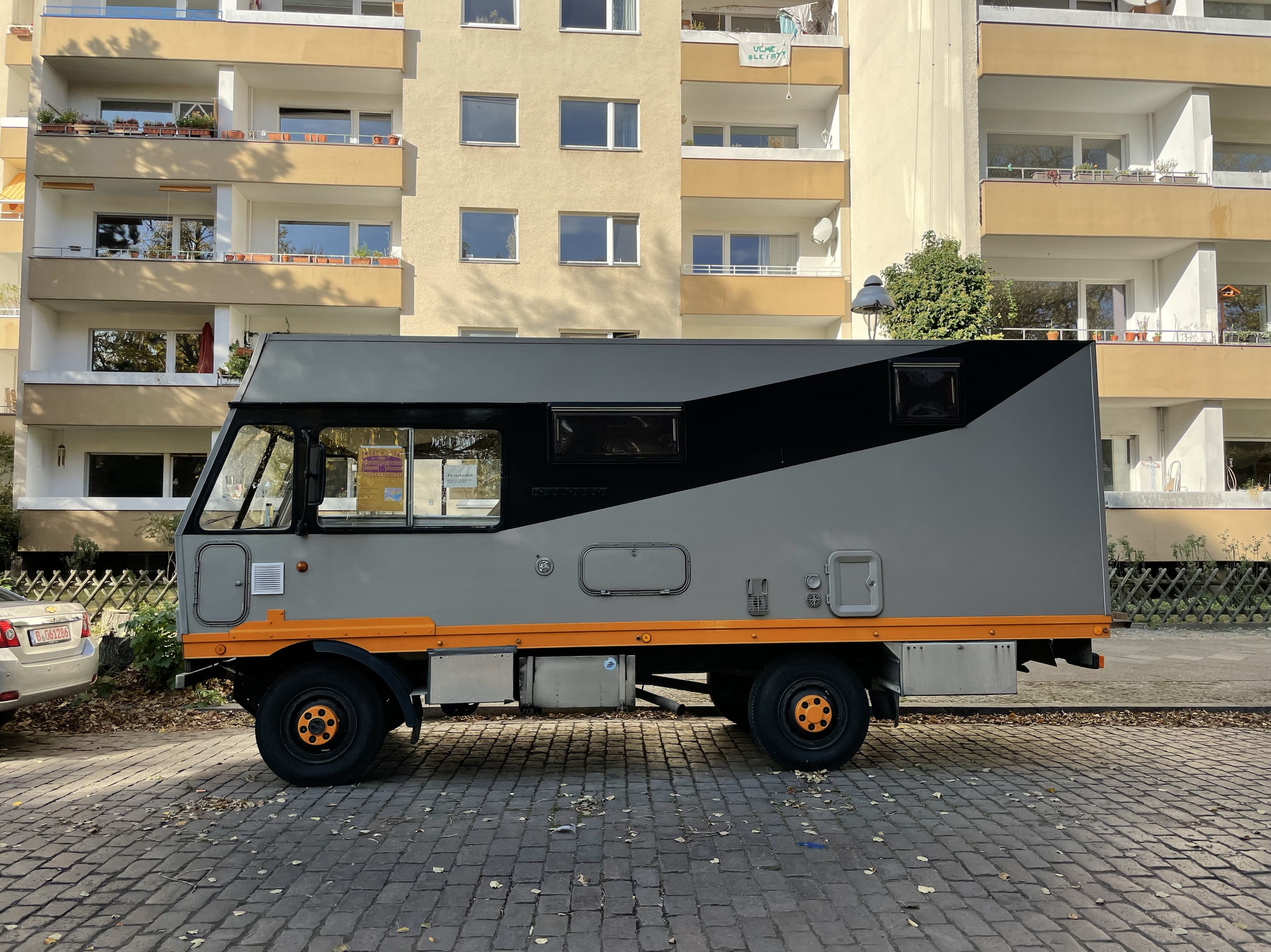 Das Basisfahrzeug ist ein Iveco Turbo 4×4 40-10 WS, der Aufbau wurde von einer Spezialfirma aus 30mm GFK gebaut, Hilfsrahmen aus Alu, daher kein Rost. Fahrzeugrahmen auch so gut wie rostfrei. Motor und Getrieb einwandfrei, zuverlässig und sofort startbereit. Der Diesel LKW-Motor mit 106.000 km gerade mal eingefahren. 4×4 zuschaltbar, Differentialsperre und untersetzte Gänge, super geländegängig durch Dreipunktlagerung der Kabine und Gummilagerung des Fahrerhauses.Reisegeschwindigkeit 85-90 Km/h, dafür praktisch keine Hindernisse.